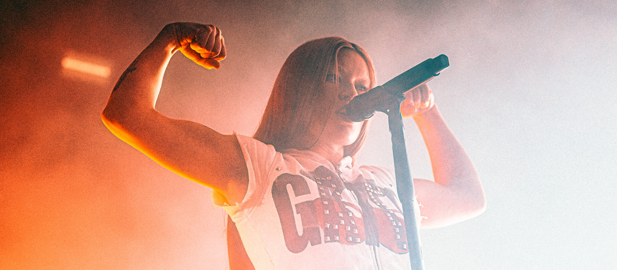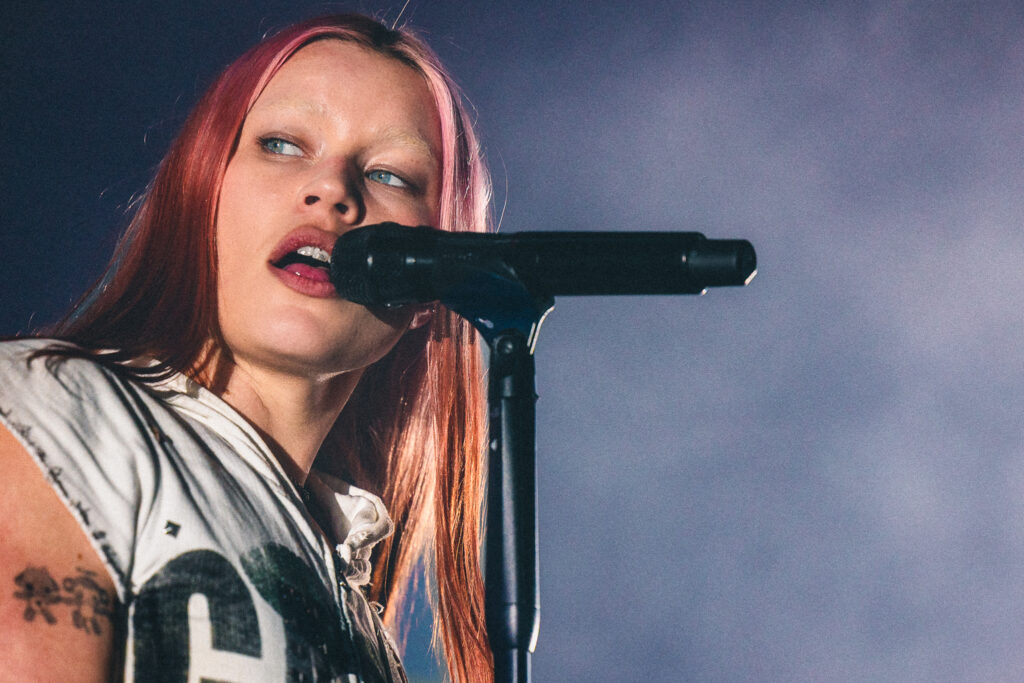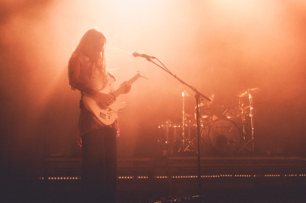 Erstmal durchatmen, Bier holen. Nach einer guten halben Stunde Pause geht das Licht aus. Der Saal pfeift, jubelt, kann es kaum erwarten. Die Bühne rot im Nebel, Blitzlicht scheppert über die Köpfe. Dann geht’s los. Zunächst nur schemenhaft erkennbar, betritt Rhian Teasdale die Bühne, beide Arme in die Luft gestemmt. Mit ihr die Band, sofort ready to go. ’catch these fists‘ heißt der erste Song, Gitarrenriffs schneiden durch das blitzende Dickicht. Der Opener macht schnell klar, wohin die Reise geht. Als zweite Single des neuen Albums ’Moisturizer‘ wird er vom Publikum schon vom ersten Akkord an abgefeiert wie ein heiß erwarteter Evergreen.